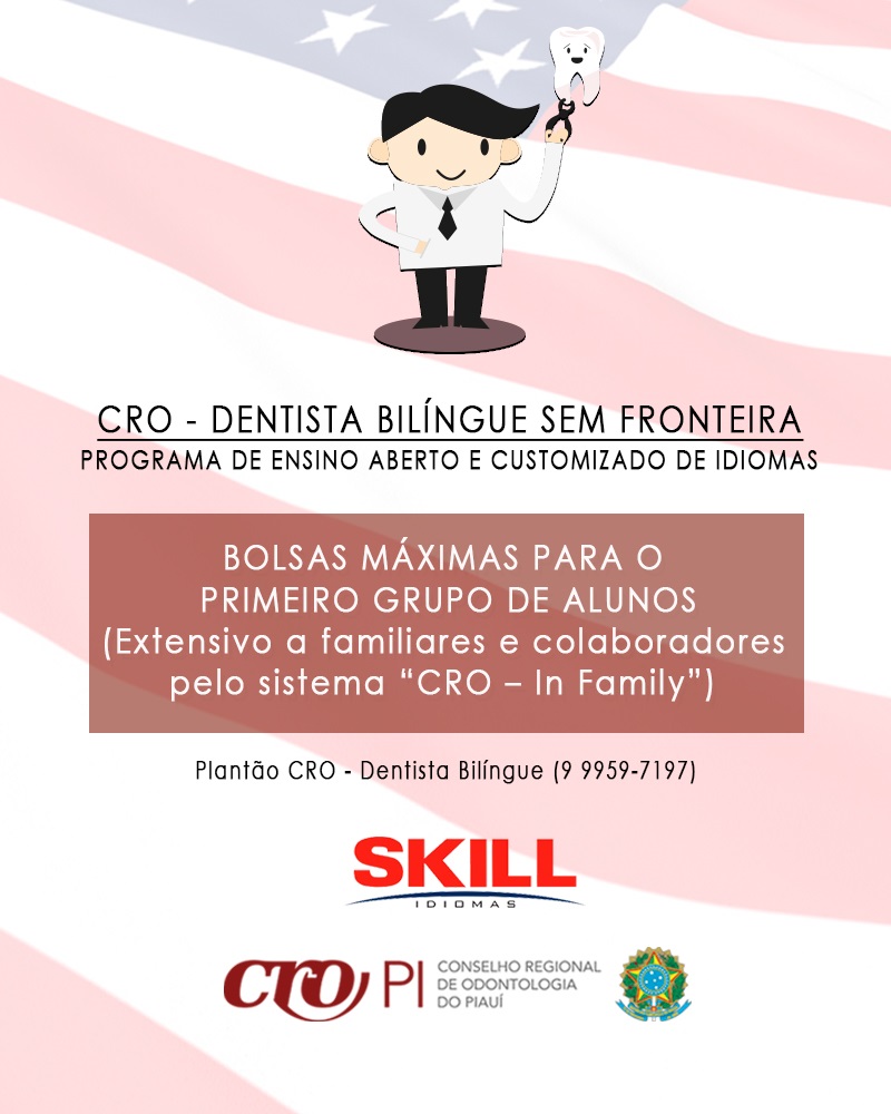 Aproveite a campanha CRO - Dentista Bilíngue Sem Fronteiras! O Conselho Regional de Odontologia do Piauí, em parceria com a escola de idiomas Skill, vai ofertar bolsas máximas ao primeiror grupo de matriculados. Não perca essa chance!