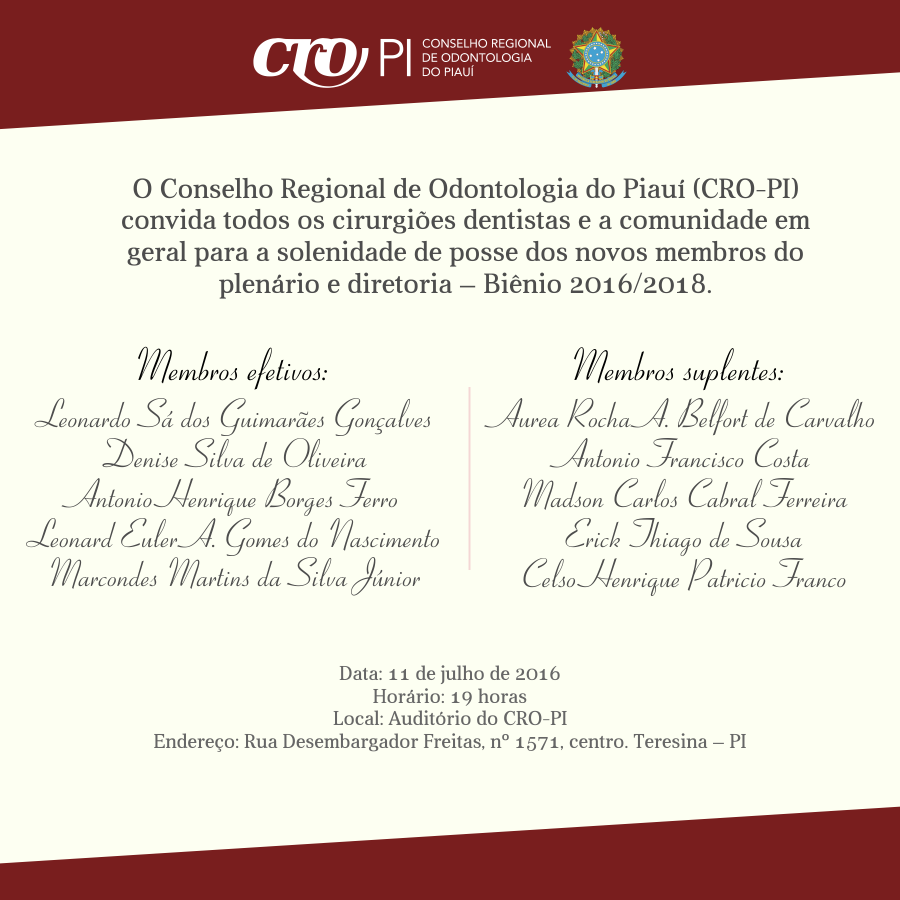O Conselho Regional de Odontologia do Piauí (CRO-PI) dá posse à nova diretoria em solenidade no auditório da sede, no centro de Teresina, na próxima segunda-feira (11), às 19h. A diretoria é composta de cinco membros efetivos e cinco suplentes que irão cumprir mandato durante o biênio 2016/2018.